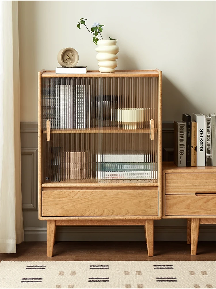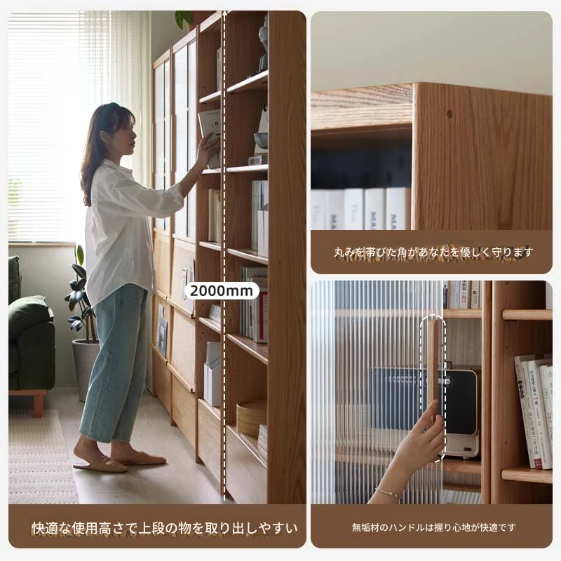 原木の美しさを引き立てる!おしゃれなリビング用スライドドア付き収納本棚 - オーク材製・デスクや書斎にも最適なフロアキャビネット N1171