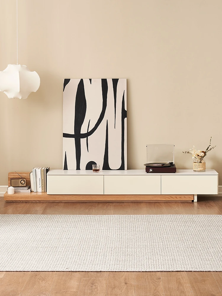 Elegant Solid Wood TV Cabinet – Expandable Floor Stand with Cream-Colored Rock Panel – Stylish Low Storage Unit for Your Living Room (Model M8083)