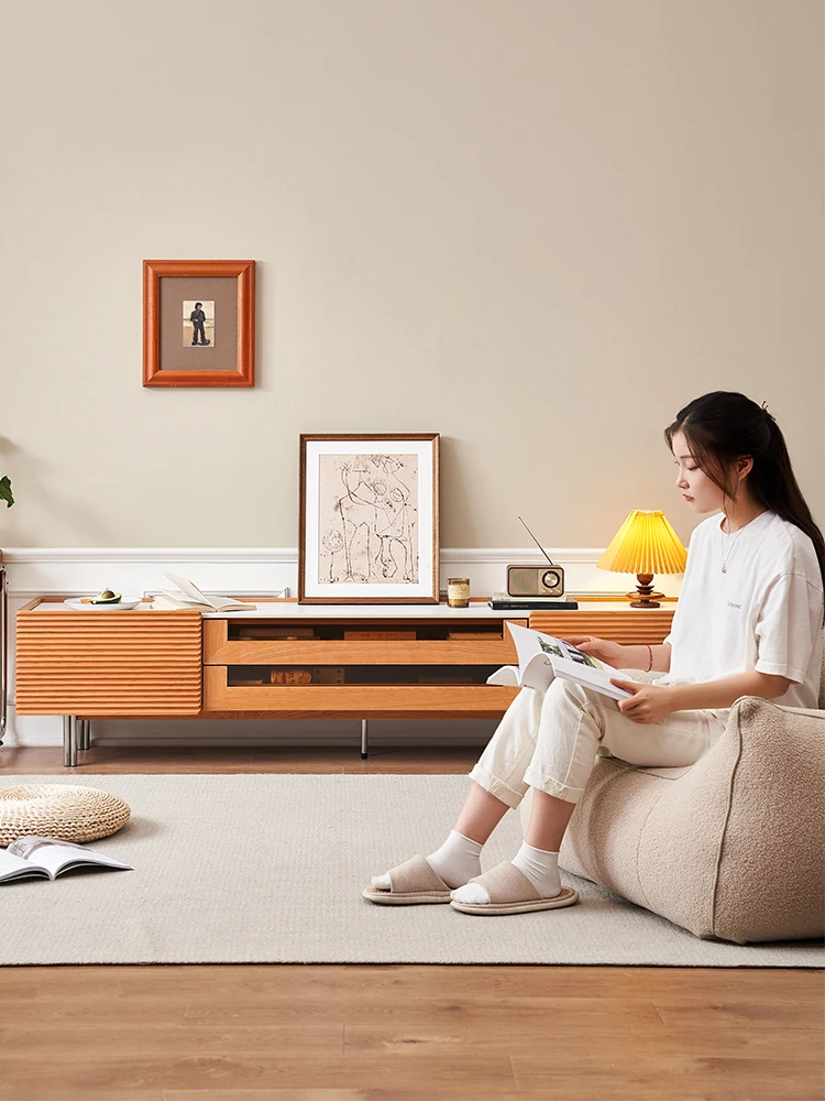 Sleek Real Wood TV Stand for Cozy Living Rooms - L9082 Cherry Wood Retro Storage Cabinet with Rock Slab Finish, Perfect for Small Spaces