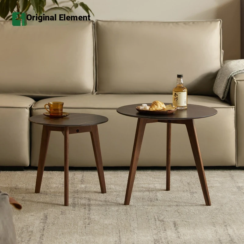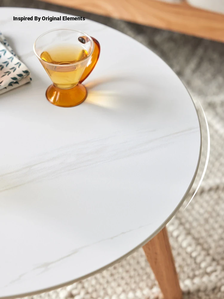 Original Element Solid Wood Coffee Table Set - Modern Minimalist Round Oak Side Table with Stone Surface for Sofa - I3077